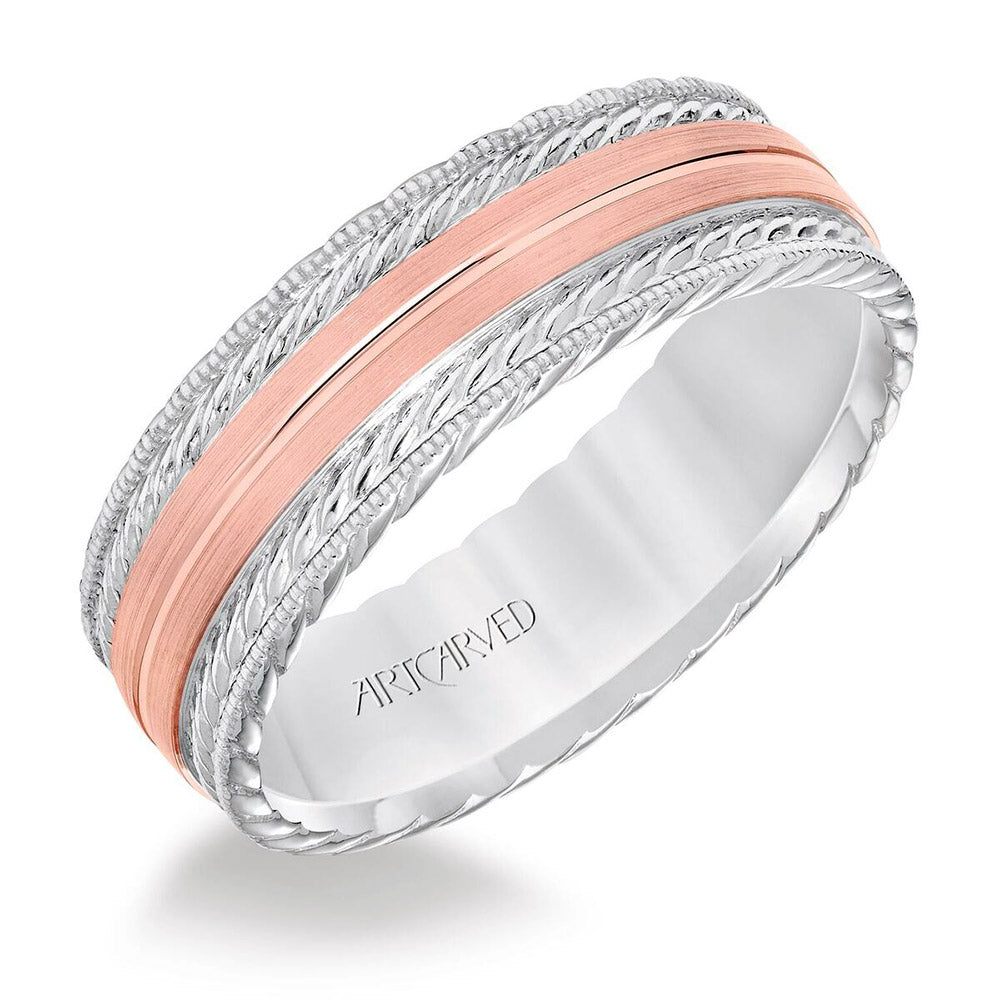14k White and Rose Gold 7mm Men's wedding band with satin finish and milgrain edge, rope treatment on top and the sides with flat profile.