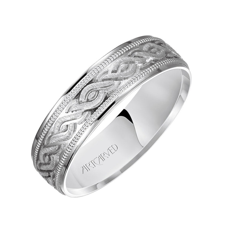 14k White Gold 6mm Comfort Fit, engraved wedding band with milgrain detail and flat edgess