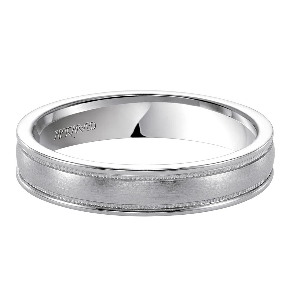14k White Gold 4.5mm Comfort Fit wedding band with brushed finish, milgrain and rolled edges
