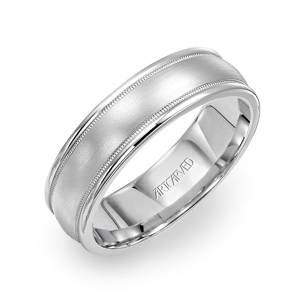 14k White Gold 7.5mm Mens Comfort Fit wedding band with brushed finish, milgrain and rolled edges