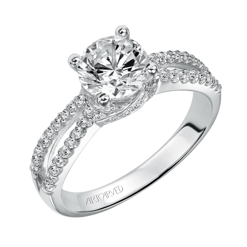 Diamond Engagement Ring With Prong Set Diamond Split Shank And Diamond Design Detail Under Center Stone.