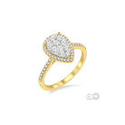 Styled in 14 karat shining yellow and white gold this pear shape ring showcases an array of 10 invisible set round cut diamonds at the center. Brilliant 36 prong set round cut diamonds, beautifully encompasses the center in pear design.