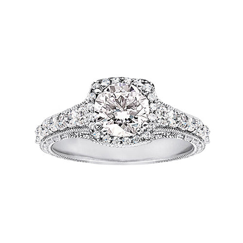 An stylish design, this diamond engagement ring showcases a prong-set diamond double halo that crowns the round center stone within a vintage styles design. This style accommodates various center stone sizes & shapes. Available in Platinum, as well as 18K