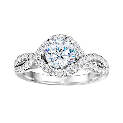 An elegant design, this diamond engagement ring showcases a diamond on an infinity style band. This style accommodates various center stone sizes & shapes. Available in Platinum, as well as 18K and 14K White, Yellow or Rose Gold.