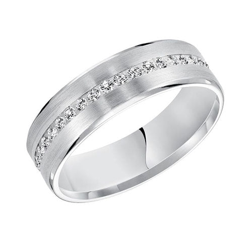 An exquisite row of 40 diamonds, satin finish and rolled edges perfect the luxurious design of this Comfort Fit, wedding band