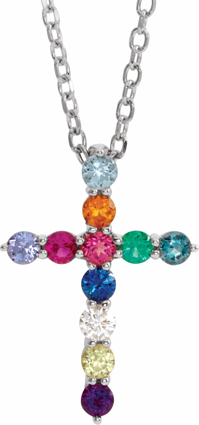 R42359 / Set / Multi-Gemstone / Round / Necklace / 14K White / I1, G-H :: 0.03 Ct / 14.6 X 10.5 Mm / 16-18 In / Polished / Multi-Gemstone Cross Necklace