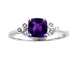 .61CT CUSHION CUT AMETHYST SET IN A 14KT WHITE GOLD MOUNTING WITH 6 ROUND BRILLANT CUT BEZEL SET DIAMONDS ON THE SIDES WEIGHING .04CTTW.