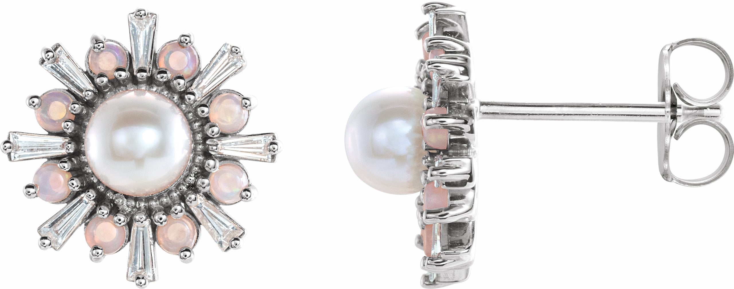 87076 / Set / 14K White / Earring / Friction Backs Included / Pair / Polished / Akoya Pearl, Genuine White Opal And 1/6 Ctw Diamond Earring