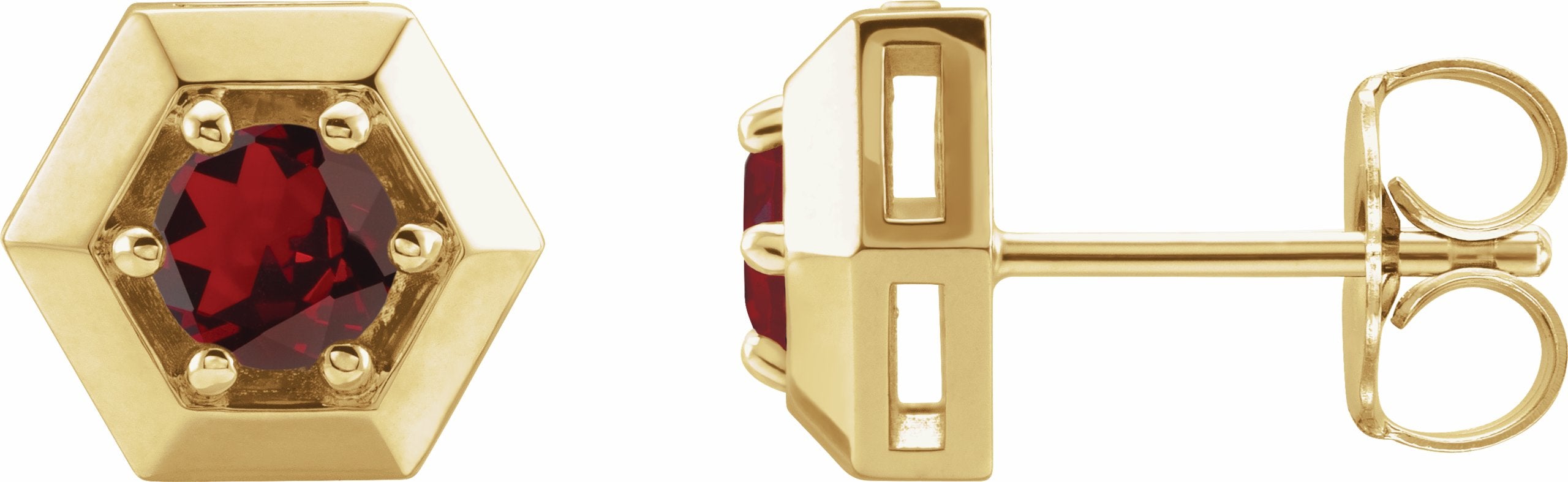87127 / 14K Yellow / Set / Round / Mozambique Garnet / Pair / Friction Post / Friction Backs Included / 6-Prong / Polished / Solitaire Hexagon Stud Earrings