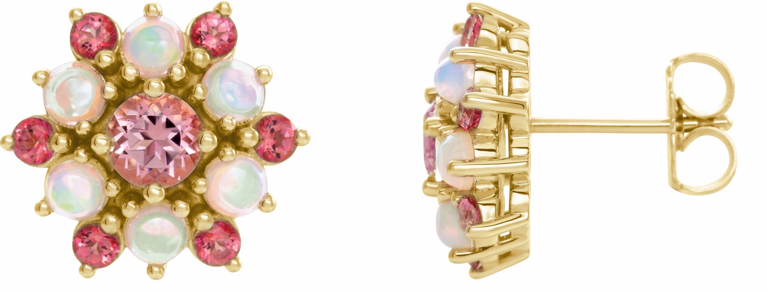 86952 / Set / 14K Yellow / Pink Tourmaline / Polished / Genuine Pink Tourmaline And Ethiopian Opal Cabochon Earrings