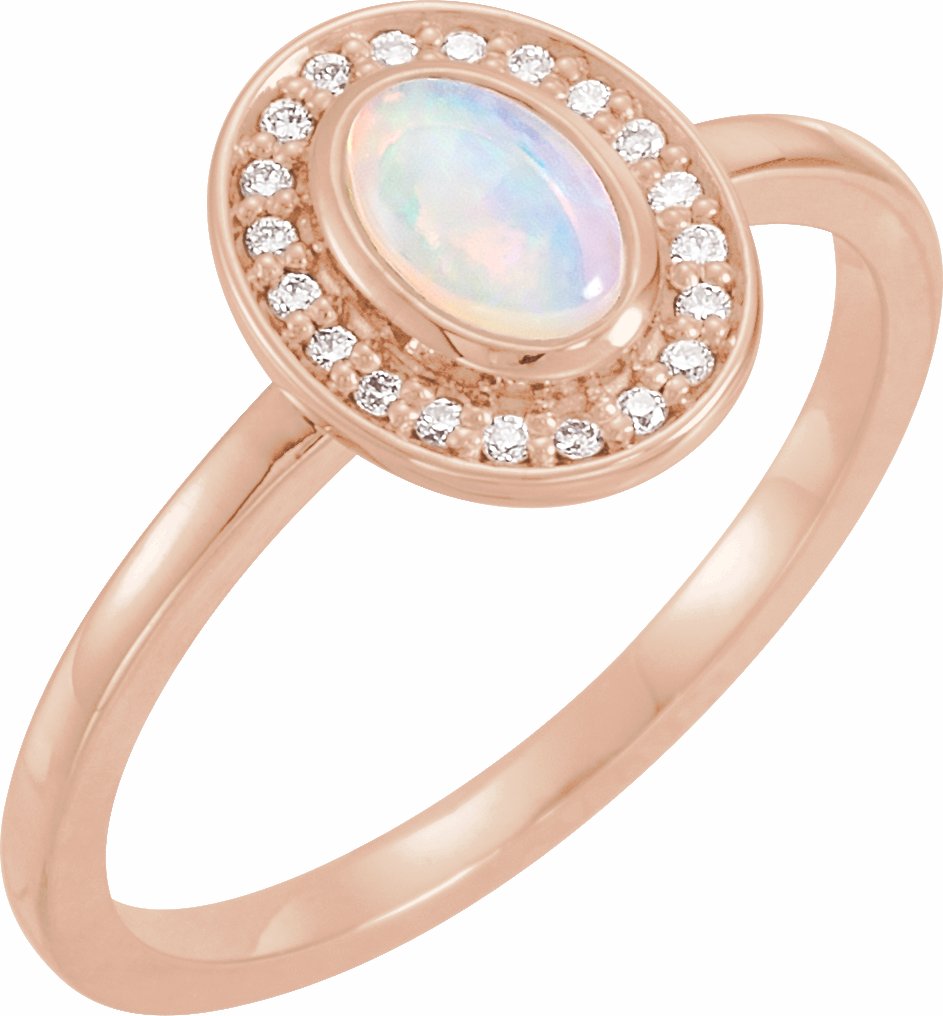 71821 / Set / 14K Rose / White Opal / Oval / 6 X 4 Mm / Polished / Genuine Cabochon Opal And .08 Ctw Diamond Ring