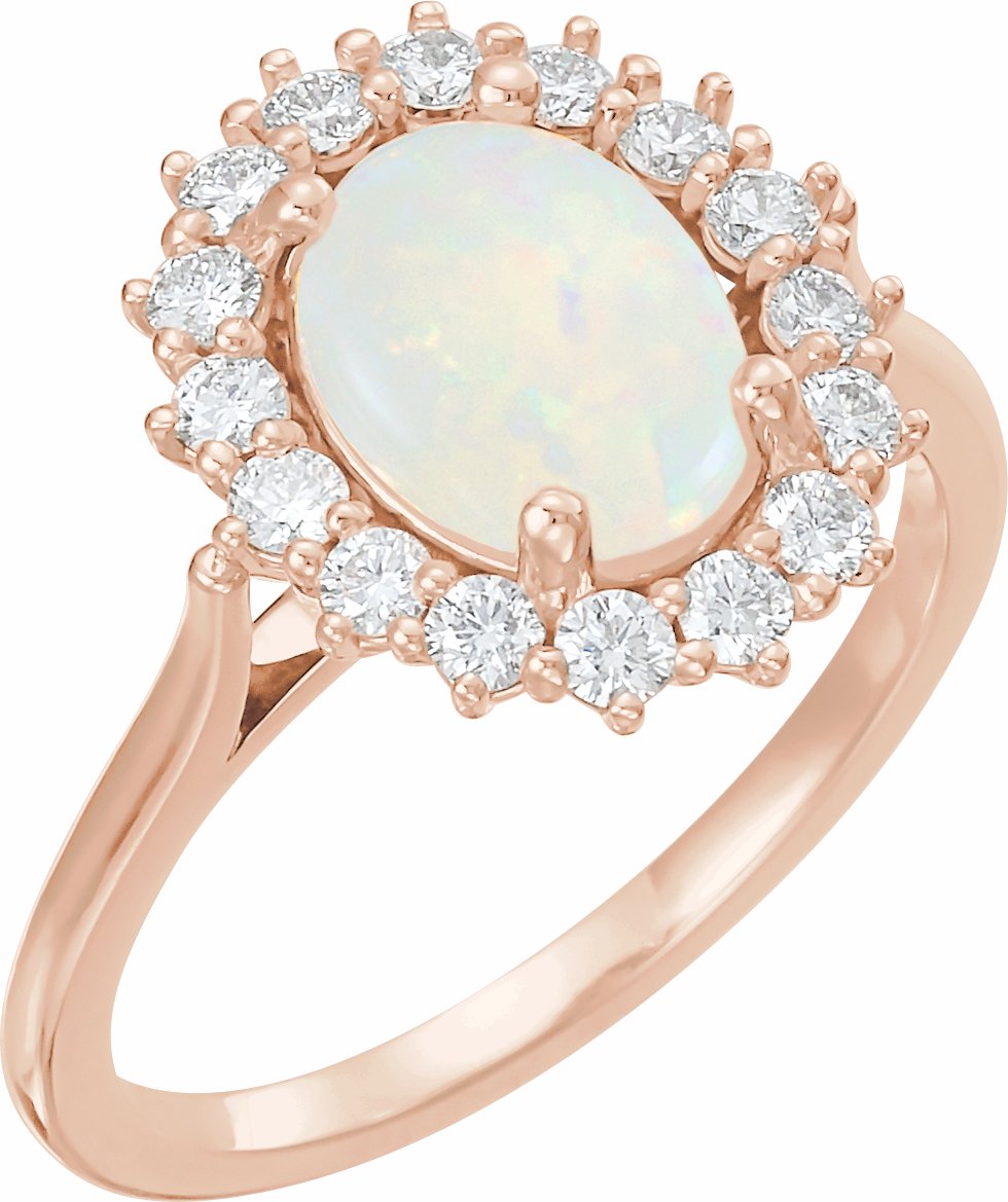 72070 / Set / 14K Rose / White Opal / Oval / 9 X 7 Mm / Polished / Genuine White Opal And 1/2 Ctw Diamond Ring