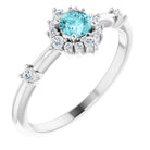 72088 / Set / 14K White / Blue Zircon / Round / 4 Mm / Polished / Genuine Blue Zircon And 1/6 Ctw Diamond Ring