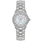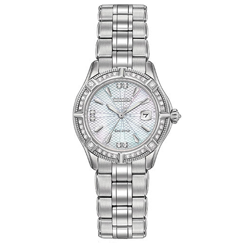 Citizen Arezzo Men's Watch features a 29mm Silver-Tone Stainless Steel Case, Diamond Bezel, Silver-Tone Stainless Steel Bracelet, Fold Over Clasp with Hidden Double Push Button, Movement: Eco-Drive E011, Functions: 3-Hand with Date, Water Resistance: WR