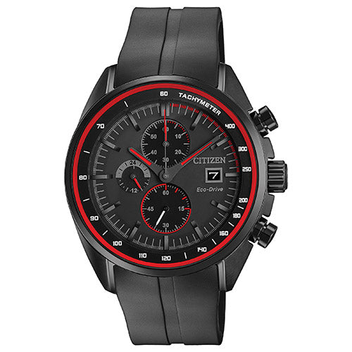 Citizen HTM Men's Watch features a 44mm Black Stainless Steel Case, Black polyurethane Strap, Buckle, Movement: Eco-Drive B612, Bluetooth, Functions: Date, 1/5 Second Chronograph, 12/24-Hour Time, Water Resistance: WR100/10Bar/333ft Swimming, Showering &