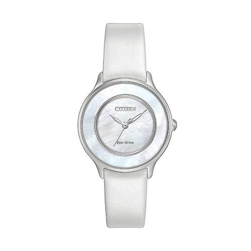 The Circle of Time watch encompasses all the style and sophistication of the Citizen L series. Featured here in a stainless steel case, pearlized white synthetic patent leather strap with white Mother-of-Pearl dial and sapphire crystal.