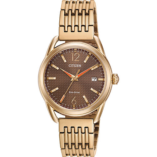 Citizen LTR Women's Watch features a 34mm Rose Gold-Tone Stainless Steel Case, Swarovski Crystal Bezel, Rose Gold-Tone Stainless Steel Bracelet, Fold Over Clasp with Push Button, Movement: Eco-Drive J810, Functions: 3-Hand with Date, Water Resistance: Sp