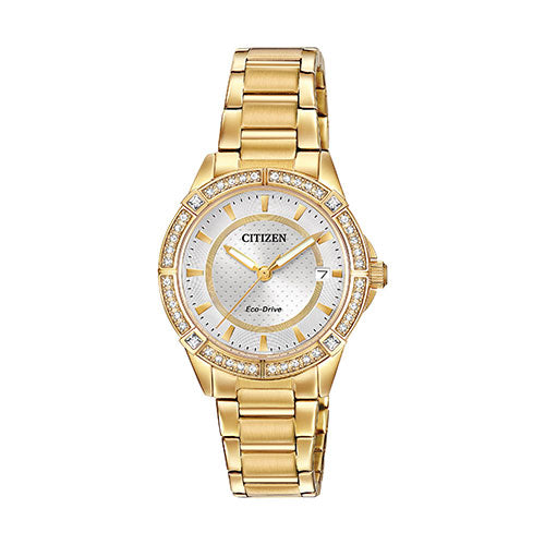 Share your fashionable point of view starting with this hip Drive from Citizen POV model with a Swarovski�� crystal adorned bezel. Featured in gold-tone stainless steel case with multi-link bracelet, silver dial and date.