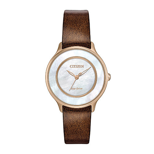 The Circle of Time watch encompasses all the style and sophistication of the Citizen L series. Featured here in a rose gold-tone stainless steel case, pearlized bronze synthetic patent leather strap with white Mother-of-Pearl dial and sapphire crystal.