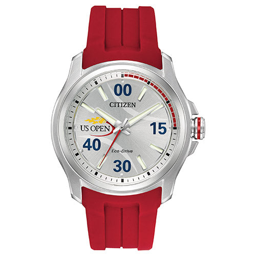 Citizen US Open Men's Watch features a 43mm Stainless Steel Case, Anti-Reflective Sapphire Crystal, Blue Dial, Stainless Steel Bracelet, Fold Over Clasp with Hidden Double Push Button, Movement: Eco-Drive E764, Functions: 3 Hand, Water Resistance: WR300/