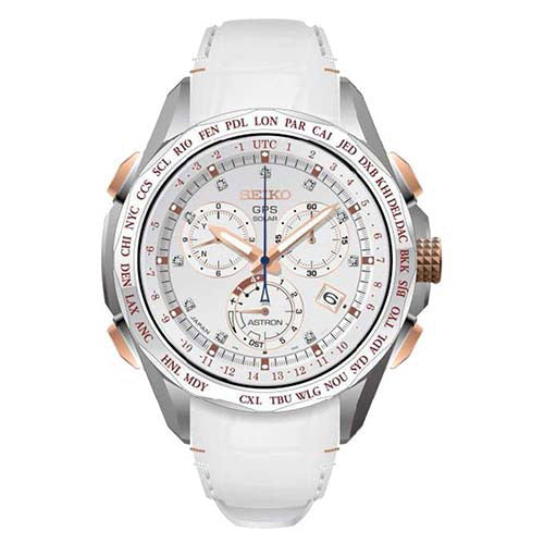 Seiko Astron Gps Solar Chronograph Women's Watch features 45.0mm Crocodile leather strap diameter, Titanium case with super-hard coating, Sapphire crystal with Seiko's proprietary super clear, anti-reflective coating ,Perpetual calendar correct to the yea