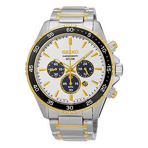 Seiko Core Solar Chronograph Men Watch powered by light energy features a 43.5 mm two-tone stainless steel case and bracelet, 6-month power reserve once fully charged, date calendar, lumibrite hands and markers, screwdown caseback and water resistant up t