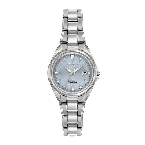 Citizen Super Titanium�� timepieces are 40% lighter then stainless steel and 5x more scratch resistant and they are hypoallergenic. The model featured here in Super Titanium�� comes with a baby blue dial and date that goes with any outfit.